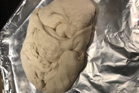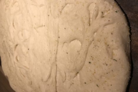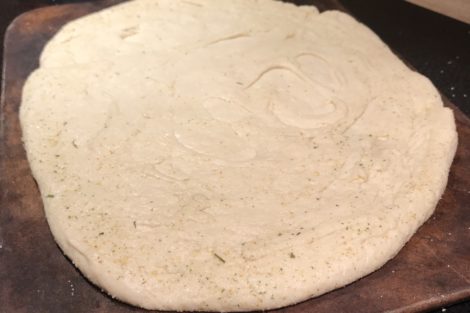 Flatten the seasoned crust onto a pizza stone or an oven safe pan.