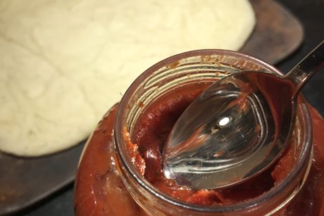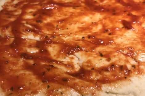 Using a spoon, spoon out between two to five spoonfuls of tomato sauce onto the crust, and spread it around with the back of the spoon.