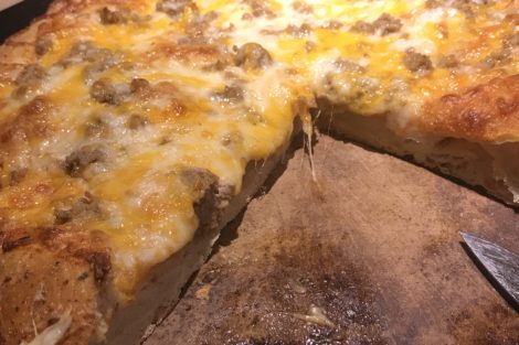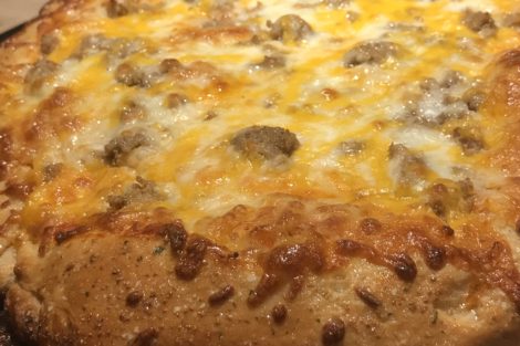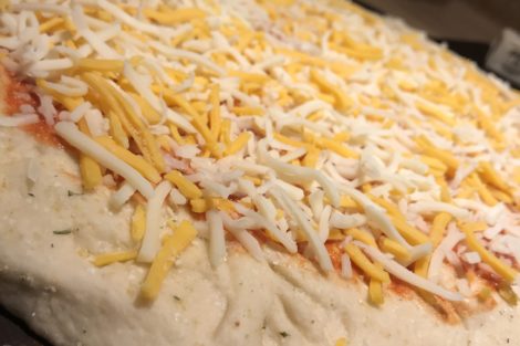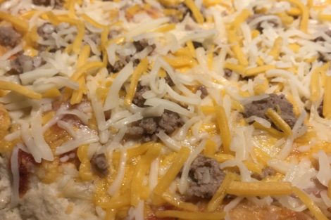 Add an even layer of cheddar and mozzarella cheese across the surface of the pizza.