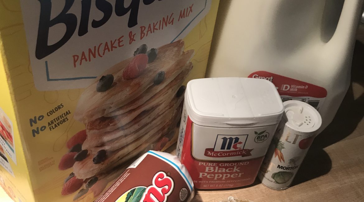 • In a large bowl, mix together the Bisquick mix and milk until there are no clumps of Bisquick left in the mixture.