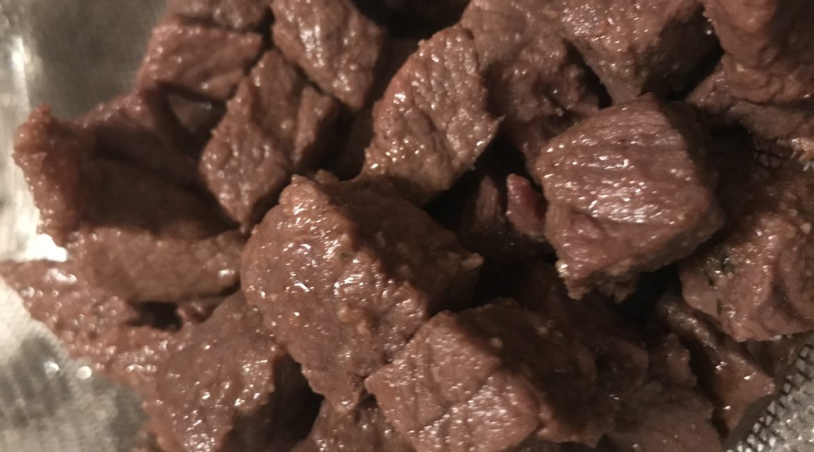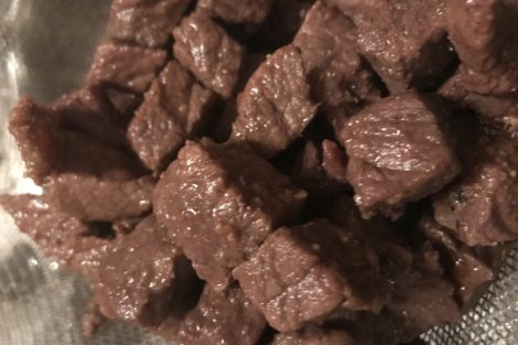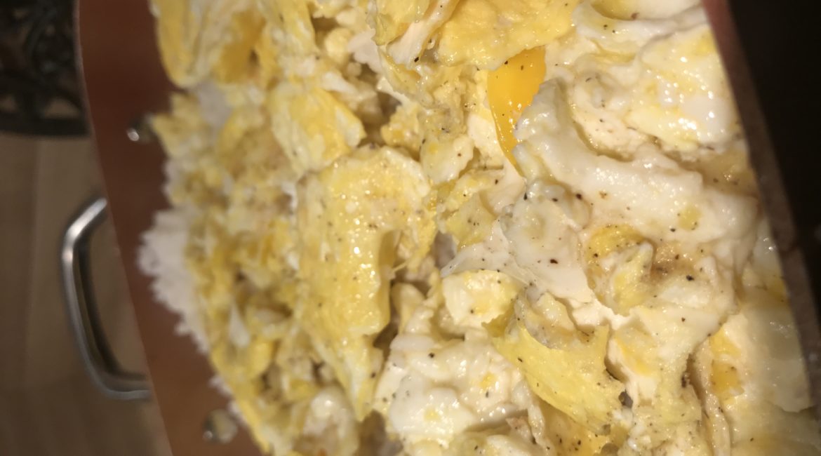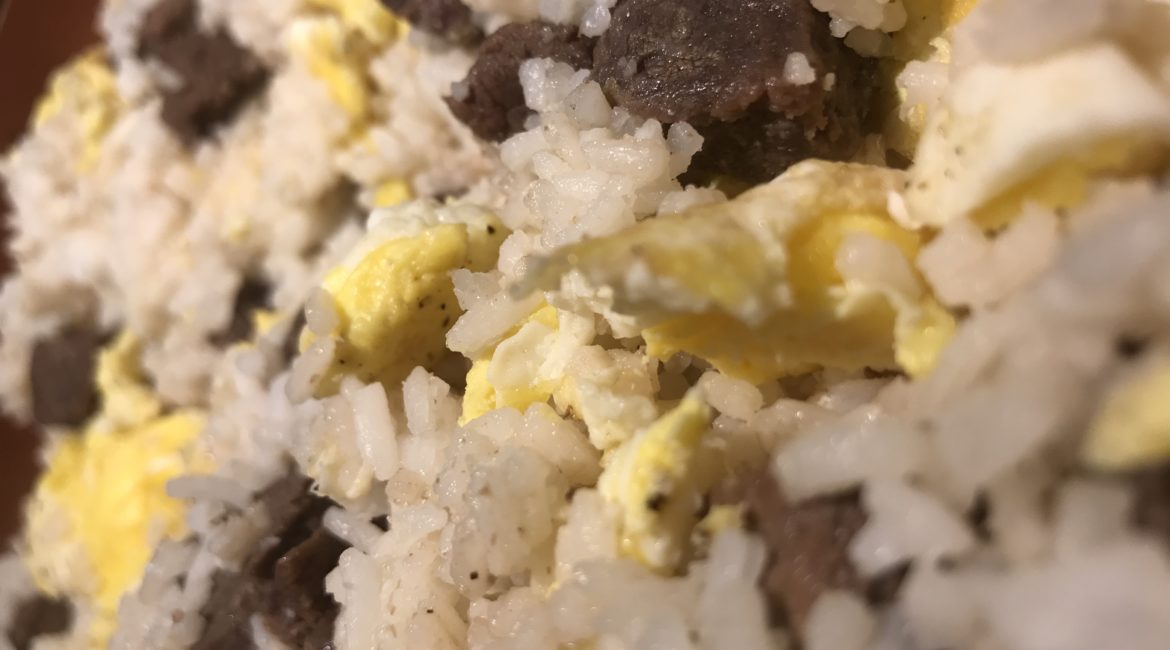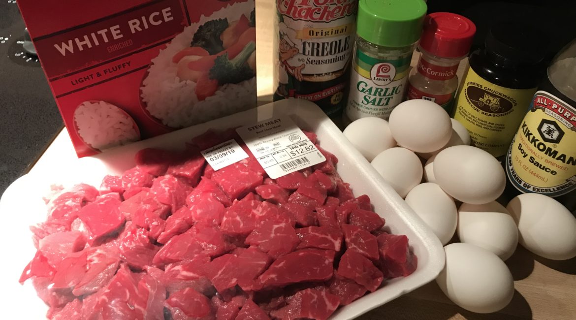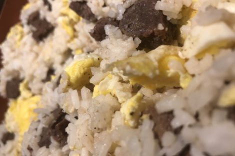 Add in your scrambled eggs, rice, and cooked beef stew meat and stir in all together.