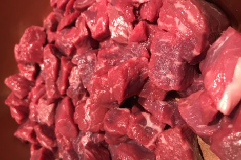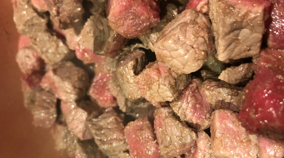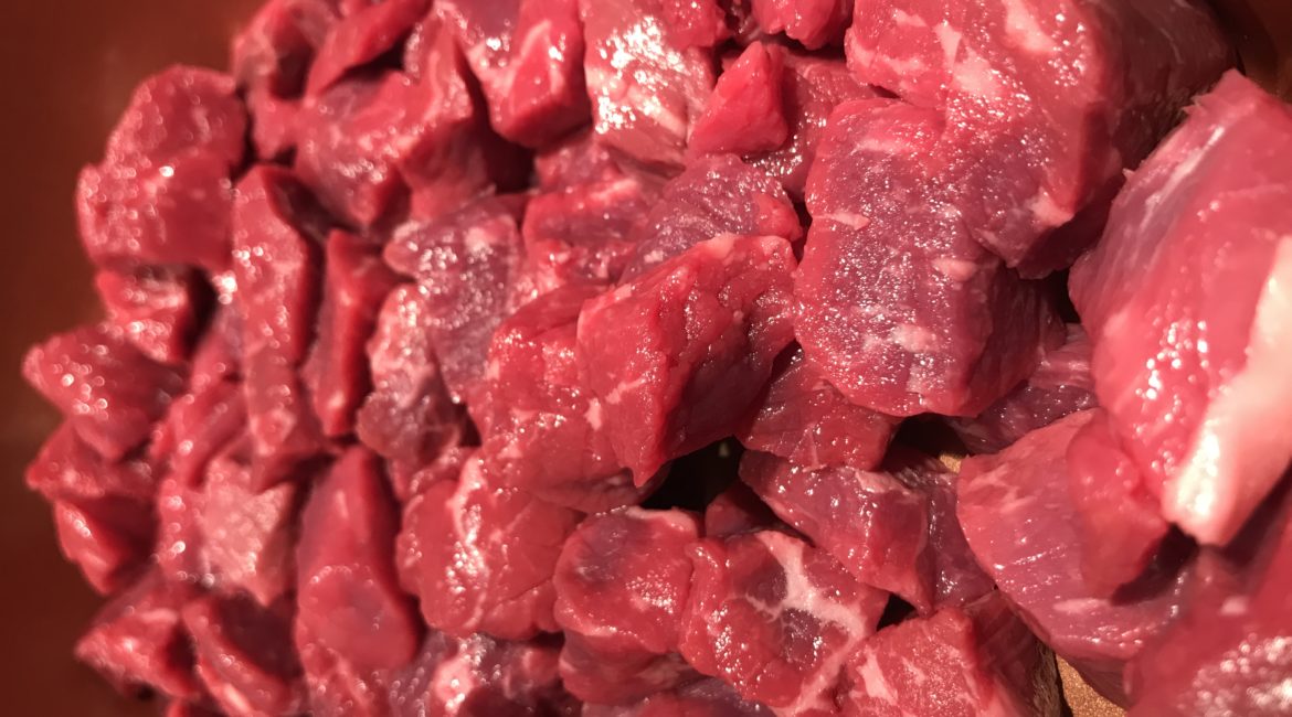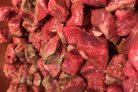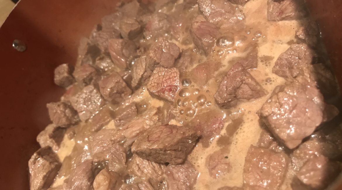 Put your beef stew meat in a pan on the stove top over high heat.