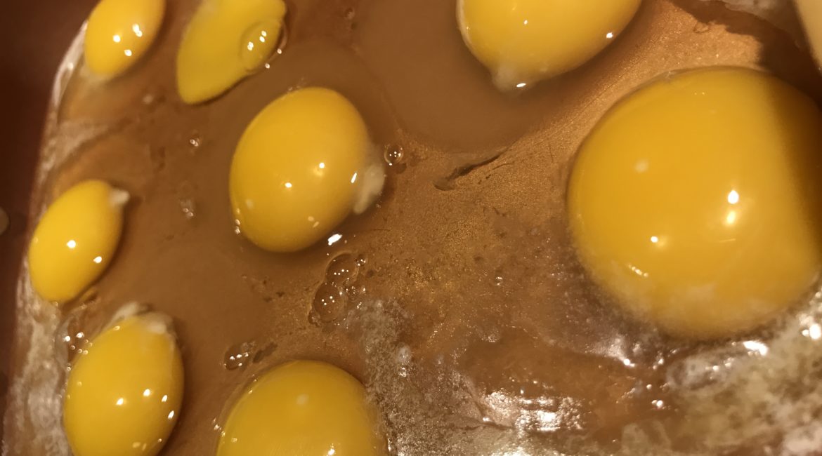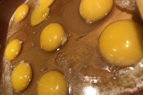Grab your eight eggs and a sauce pan and scramble them.